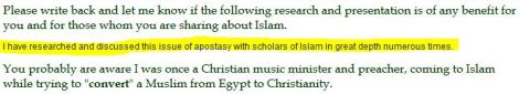 الترجمة: ” وقد بحثتُ في مسألة الردة وناقشتُ فيها علماء الإسلام بالتوسع عدة مرات.”