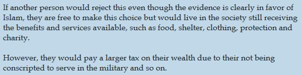 الترجمة: “الذي يختار أن يرفض هذا [الإسلام] حتى وإن كانت الأدلة تدله على صحة الإسلام، فهو على خيار، وسيستمر [المرتد] يعيش في المجتمع [الإسلامي] مستفيدًا من مصالحه والخدمات العامة، كالطعام، والسكن، والملابس، والأمن، والصدقة. لكنه سوف يضربون على أمواله زيادة من الجزية لعدم مشاركته في الجيش وما إلى ذلك.”